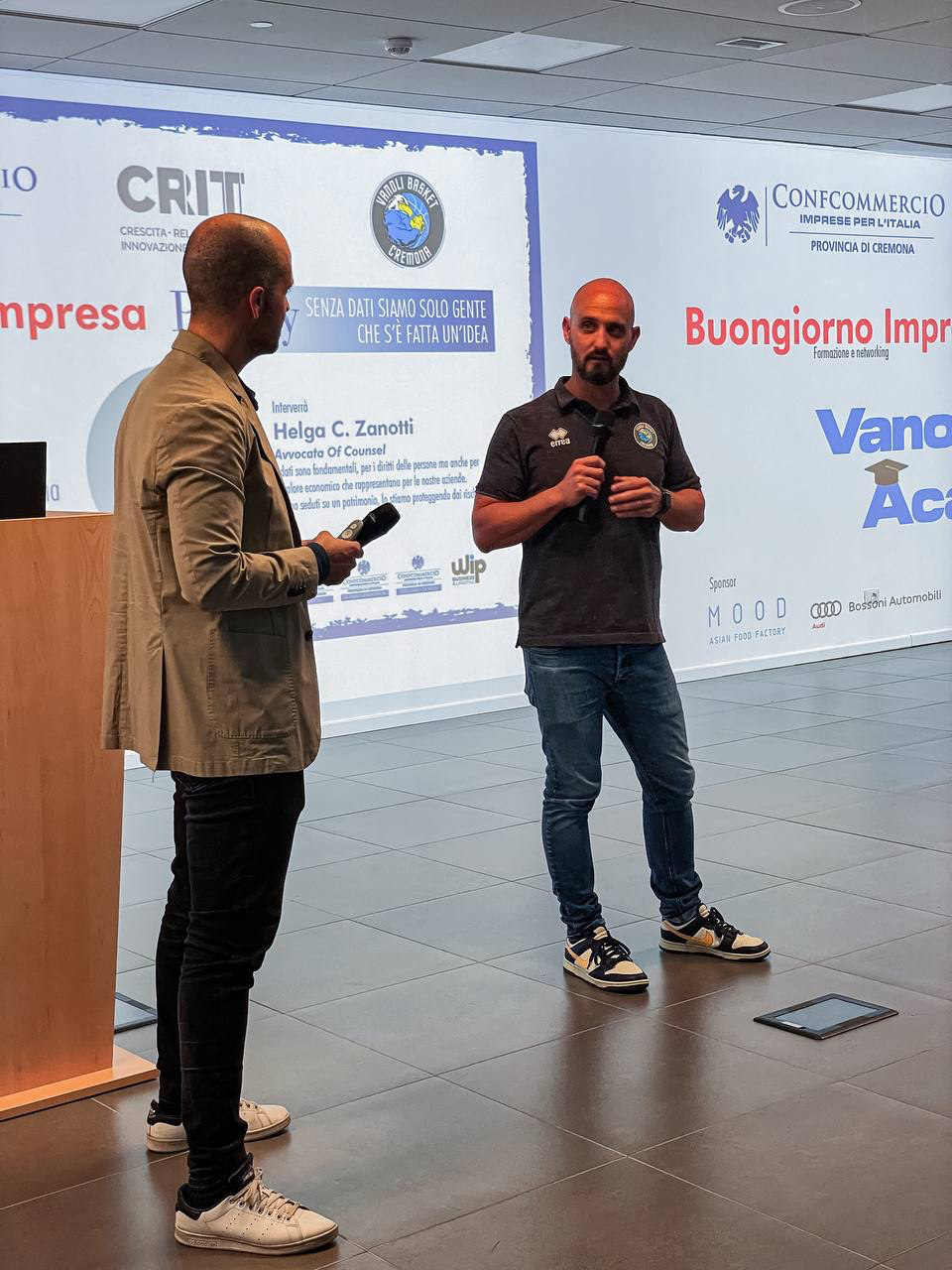 Ad aprire l’incontro Davide Garufi, Presidente dei giovani Imprenditori della provincia di Cremona, e Roberto Spagnoli, Responsabile Marketing Vanoli Basket.